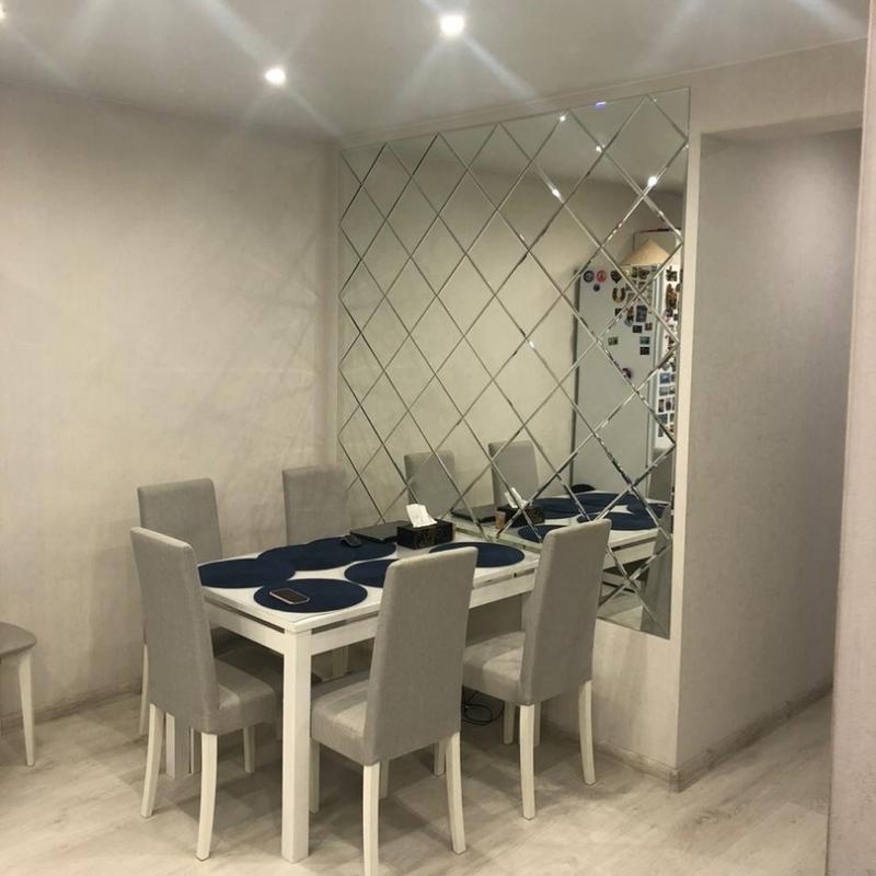 Использована квадратная серебристая зеркальная плитка размером 18х18.